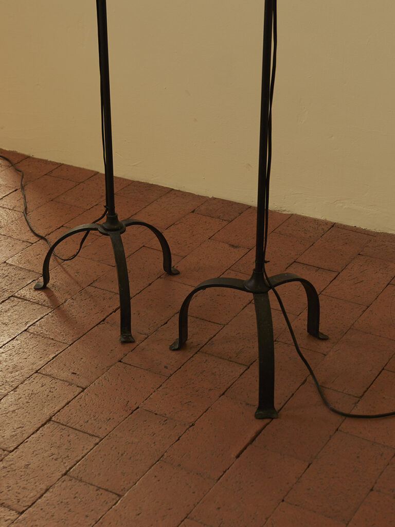 WROUGHT IRON FLOOR LAMPS WITH LINEN SHADES United States, Early 20th CenturyH 51.5” x D 17”$400 Each, Two AvailableInquire Tearsheet Back to Gallery